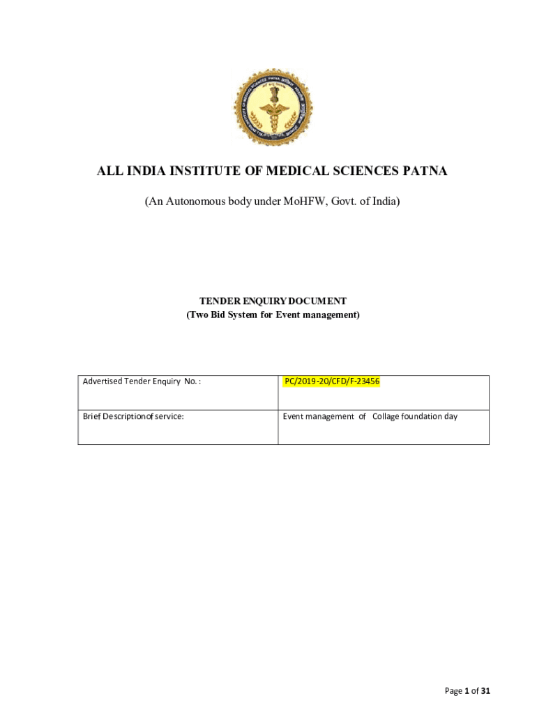 ALL INDIA INSTITUTE OF MEDICAL SCIENCES PATNA (An Autonomous body under Mohawk, Govt. of India)TENDER Inquiry DOCUMENT (Two Bid System for Event management)Advertised Tender Inquiry No. PC/201920/CFD/F23456Brief