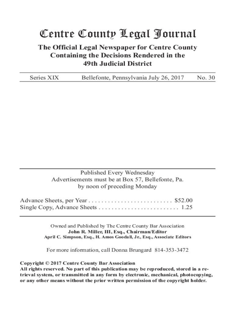 Center County Legal Journalese Official Legal Newspaper for Center County Containing the Decisions Rendered in the 49th Judicial DistrictSeries XIXBellefonte, Pennsylvania July 26, 2017No. 30Published