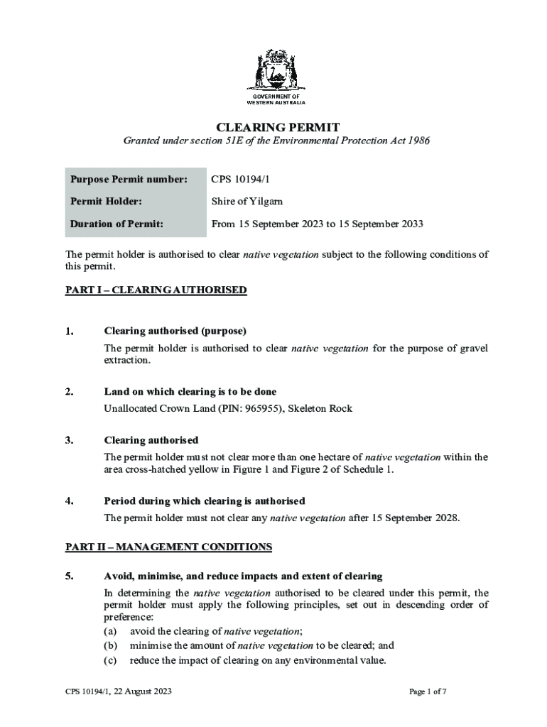 Granted under section 51E of the Environmental Protection Act 1986Purpose Permit number:CPS 10194/1Permit Holder:Shire of YilgarnDuration of Permit:From 15 September 2023 to 15 September