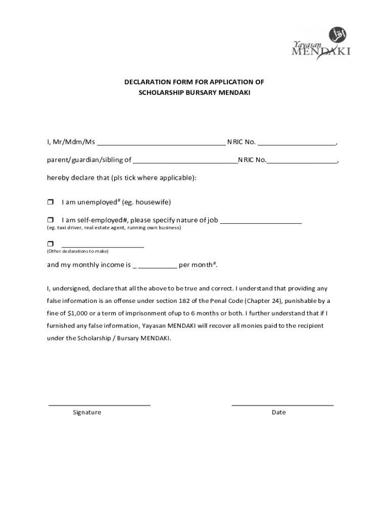 DECLARATION FORM FOR APPLICATION OF SCHOLARSHIP BURSARY MANDARIN, Mr/MDM/Ms ___ ERIC No. ___, parent/guardian/sibling of ___ERIC No.___, hereby declare that (pls tick where applicable): I am unemployed#