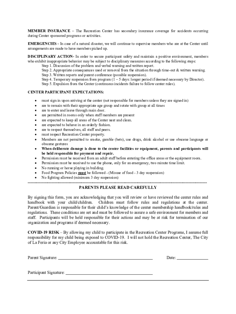 LA BERIA RECREATION CENTER PARTICIPANT HANDBOOK This handbook is designed to inform participants and parents of the policies and practices of the Recreation Center. It contains rules by which the