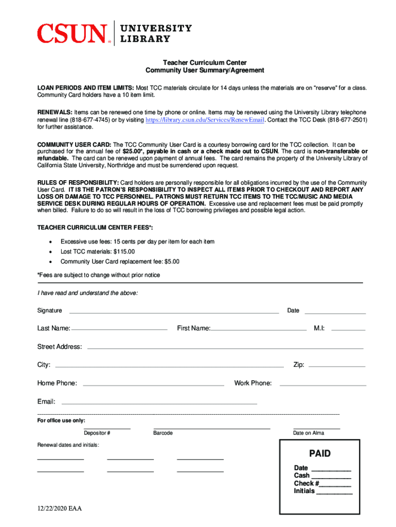 Teacher Curriculum Center Community User Summary/Agreement LOAN PERIODS AND ITEM LIMITS: Most TCC materials circulate for 14 days unless the materials are on reserve for a class. Community cardholders