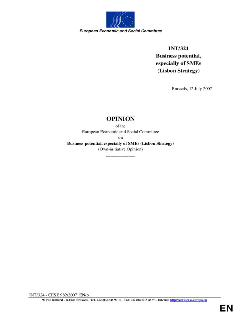 European Economic and Social Committee INT/324 Business potential, especially of SMEs (Lisbon Strategy)Brussels, 12 July 2007OPINION of the European Economic and Social Committee on Business potential,