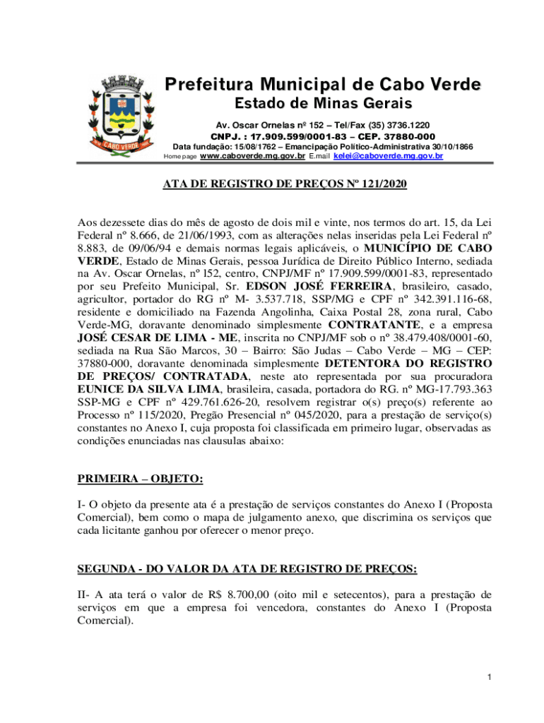 Prefecture Municipal de Cabo Verde Est ado de Mines Series. Oscar Ordeals n 152 Tel/Fax (35) 3736.1220 CNJ. 17.909.599/000183 CEP. 37880000 Data funds: 15/08/1762 Emancipate PolticoAdministrativa