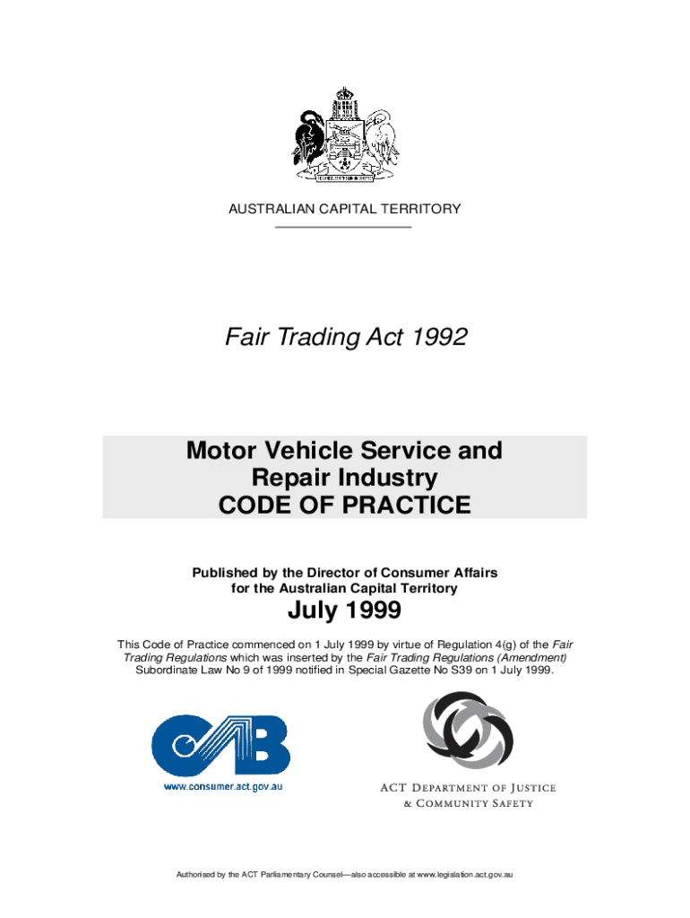 AUSTRALIAN CAPITAL TERRITORYFair Trading Act 1992Motor Vehicle Service and Repair Industry CODE OF PRACTICE Published by the Director of Consumer Affairs for the Australian Capital Territory July