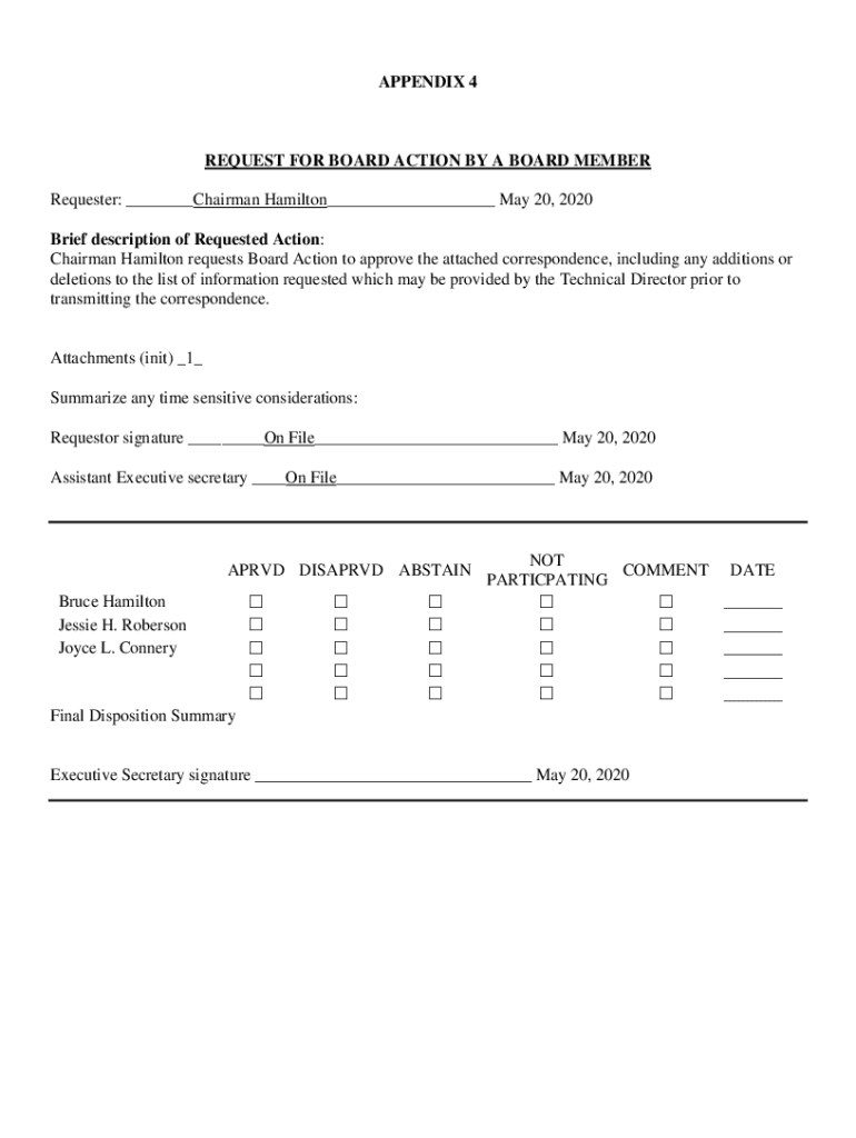 APPENDIX 4REQUEST FOR BOARD ACTION BY A BOARD MEMBER Requester: ___Chairman Hamilton___ May 20, 2020, Brief description of Requested Action: Chairman Hamilton requests Board Action to approve the