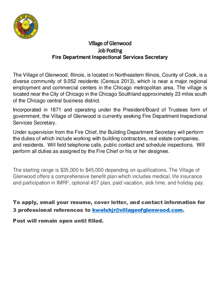 Village of Glenwood Job Posting Fire Department Inspection Services Secretary Village of Glenwood, Illinois, is located in Northeastern Illinois, County of Cook, is a diverse community of 9,052 residents