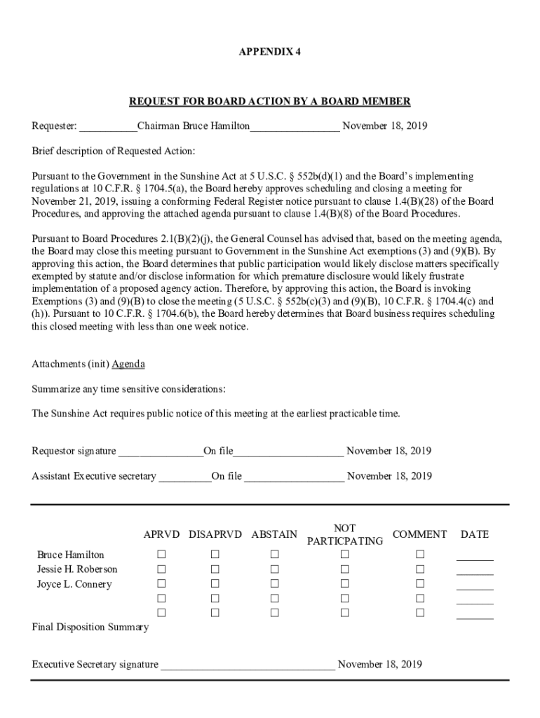 APPENDIX 4REQUEST FOR BOARD ACTION BY A BOARD MEMBER Requester: ___Chairman Bruce Hamilton___ November 18, 2019, Brief description of Requested Action: Pursuant to the Government in the Sunshine Act