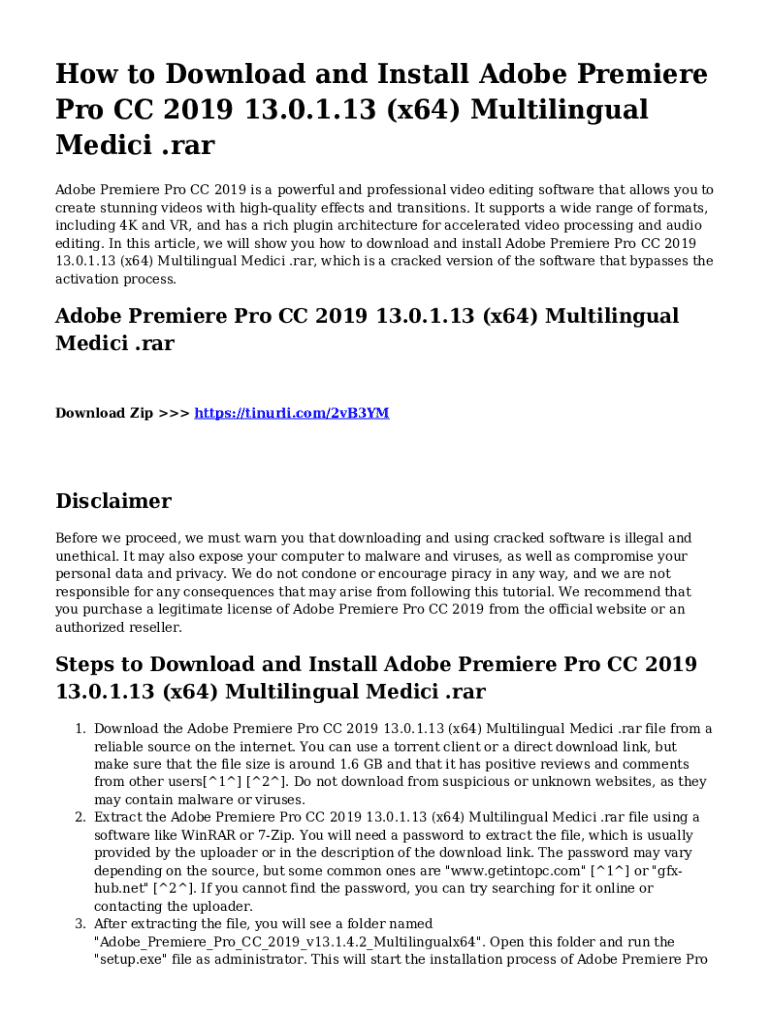How to Download and Install Adobe Premiere Pro CC 2019 13.0.1.13 (x64) Multilingual Medici .rar Adobe Premiere Pro CC 2019 is a powerful and professional video editing software that allows you to