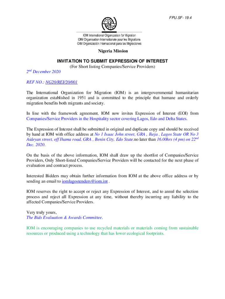 FPU.SF 19.4Nigeria Mission INVITATION TO SUBMIT EXPRESSION OF INTEREST (For Short listing Companies/Service Providers) ND 2 December 2020 REF NO.: NG20/REI/20/001 The International Organization for