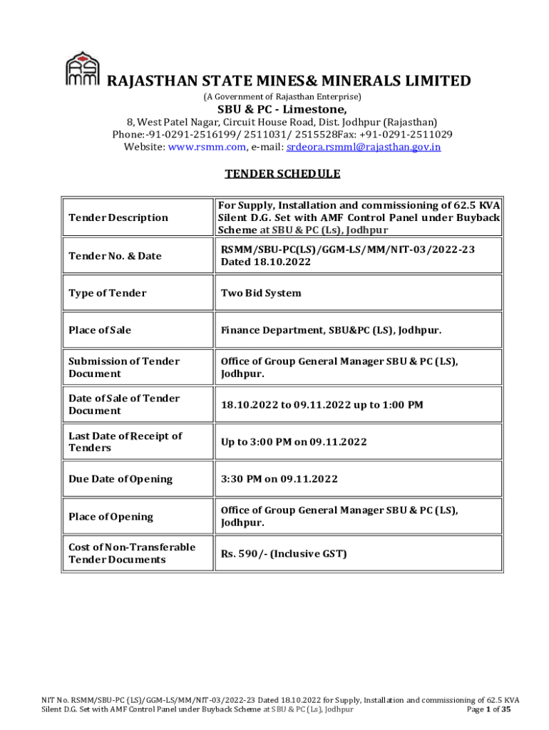 RAJASTHAN STATE MINES MINERALS LIMITED (A Government of Rajasthan Enterprise)SBS & PC Limestone,8, West Patel Nagar, Circuit House Road, Dist. Jodhpur (Rajasthan) Phone:9102912516199/ 2511031/ 2515528Fax: