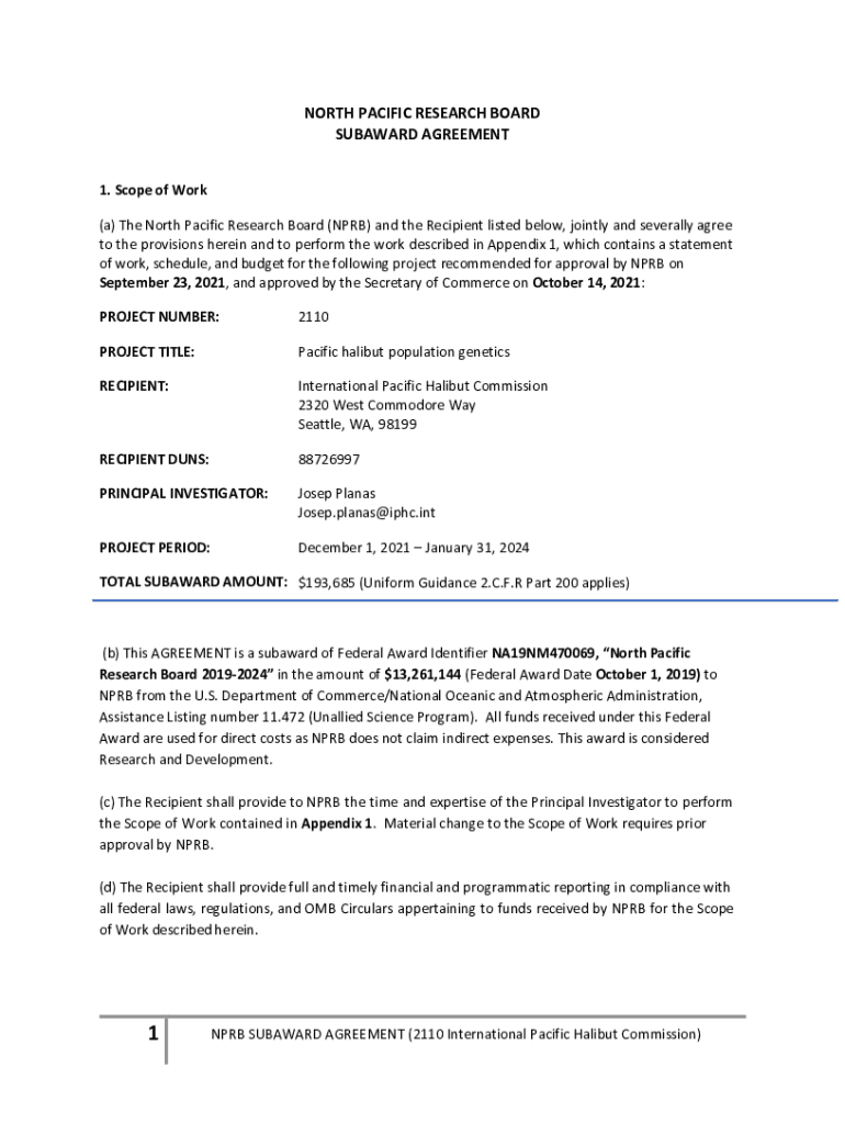NORTH PACIFIC RESEARCH BOARD SEAWARD AGREEMENT 1. Scope of Work (a) The North Pacific Research Board (NPR) and the Recipient listed below, jointly and severally agree to the provisions herein and