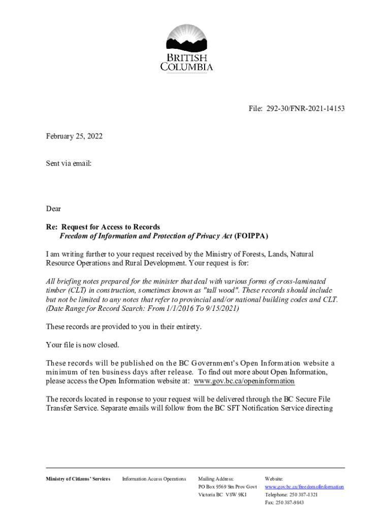File: 29230/FNR202114153 February 25, 2022, Sent via email:Dear Re: Request for Access to Records Freedom of Information and Protection of Privacy Act (POPPA) I am writing further to your request