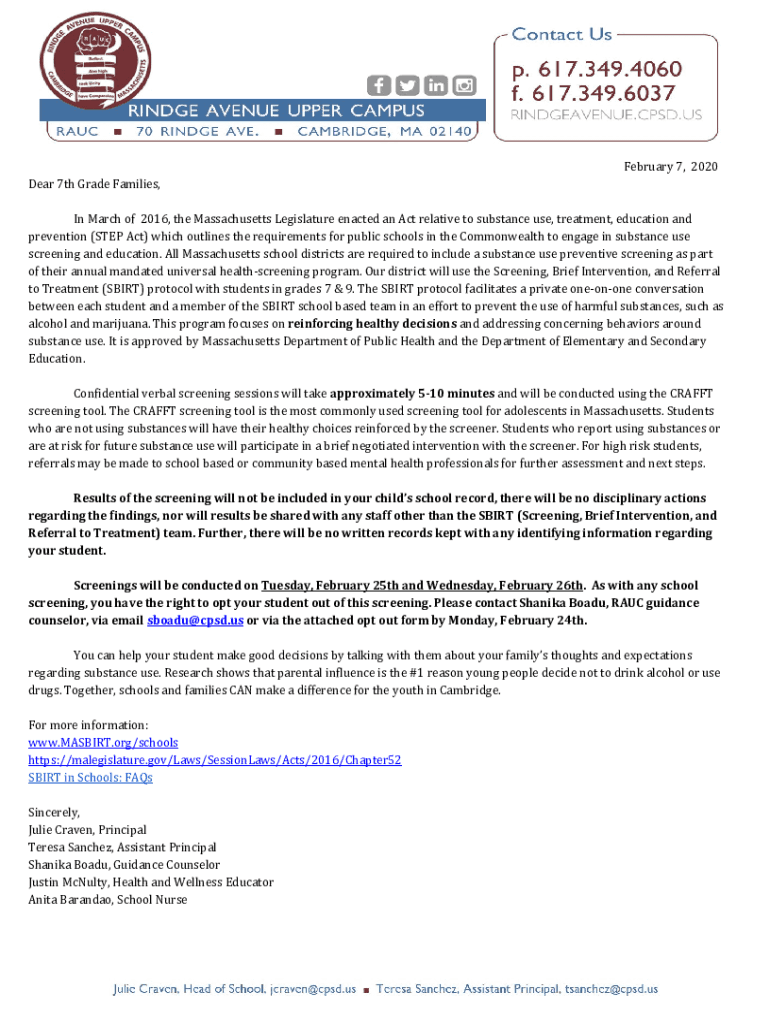 February 7, 2020, Dear 7th Grade Families, In March 2016, the Massachusetts Legislature enacted an Act relative to substance use, treatment, education and prevention (STEP Act) which outlines the