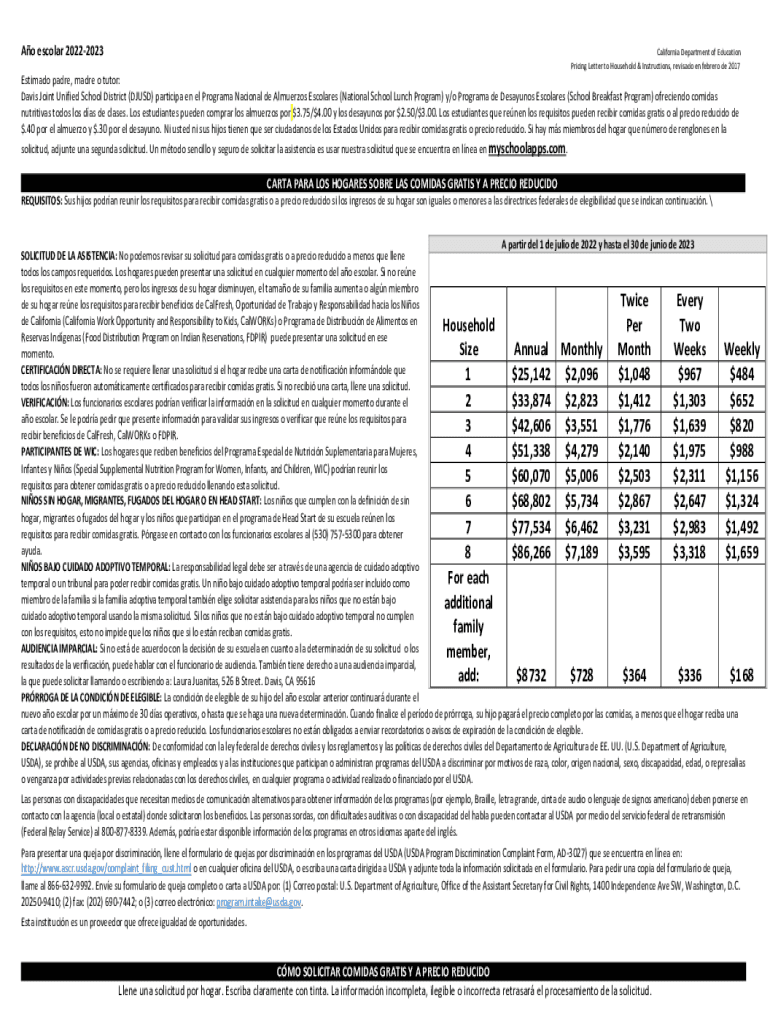 AO escolar 20222023California Department of Education Pricing Letter to Household & Instructions, revised en Ferraro de 2017Estimado padre, made o tutor: Davis Joint Unified School District (DJ USD)