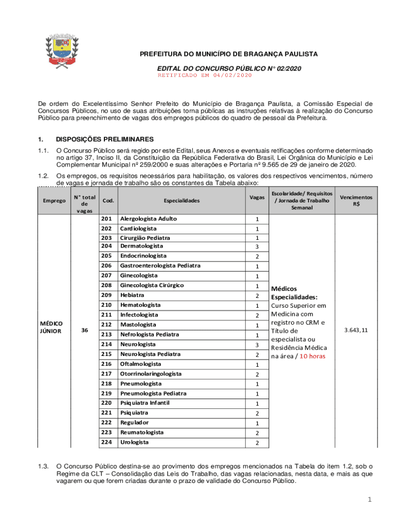 PREFECTURE Does MUNICIPAL DE BANANA BAUTISTA EDIT AL DO CONCURS PBL ICO N 02/2020 RETIFICADO EM 04/02/2020De order do Excelentssimo Senior Predator do Municipal de Bragana Bautista, a Comics Especial