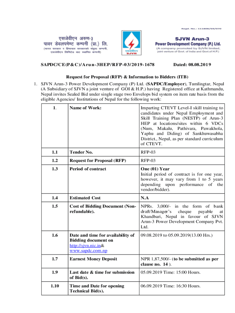 SADC/CE(P&C)/Arun3HEP/RFP03/20191678Dated: 08.08.2019Request for Proposal (RFP) & Information to Bidders (ITB) 1. SVN Arun3 Power Development Company (P) Ltd. (SADC/Employer), Tumlingtar, Nepal (A
