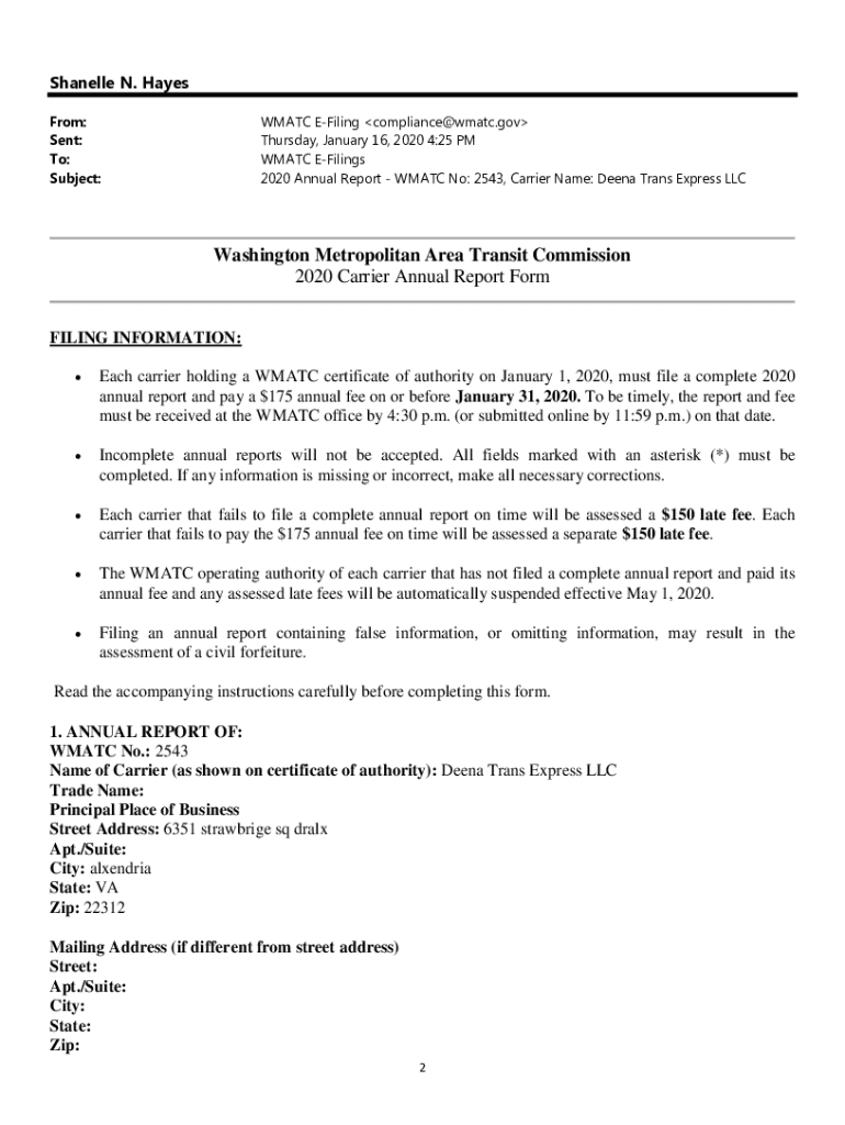 Janelle N. Hayes From: Sent: To: Subject:WHAT Filing compliance@wmatc.gov Thursday, January 16, 2020 4:25 PM WHAT Filings 2020 Annual Report WHAT No: 2543, Carrier Name: Deena Trans Express LLC Washington