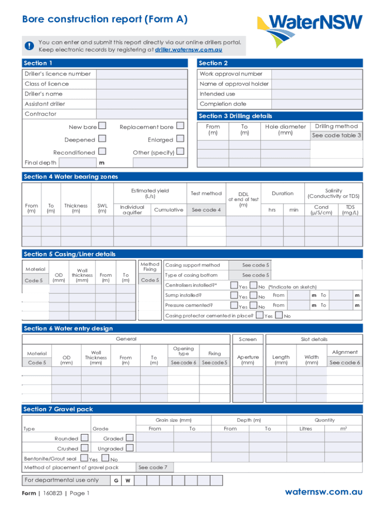 Bore construction report (Form A) You can enter and submit this report directly via our online drillers portal. Keep electronic records by registering at driller.waternsw.com.section 1Section 2Drillers