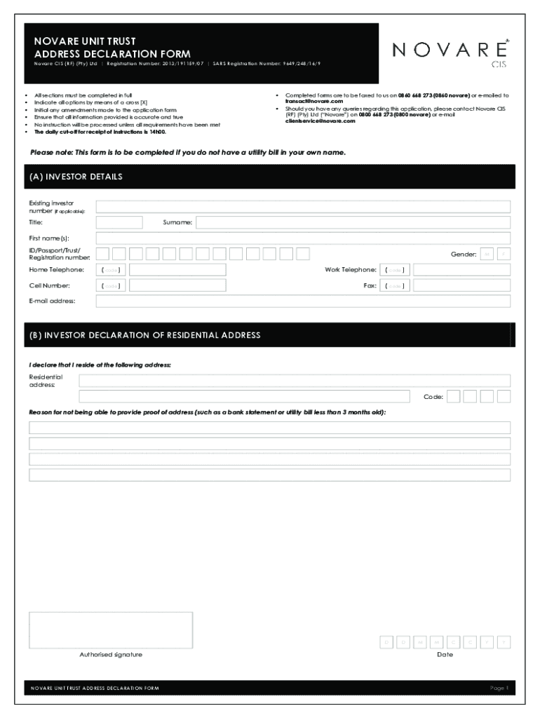 NOVAE UNIT TRUST ADDRESS DECLARATION FORMNovare CIS (RF) (Pty) Ltd | Registration Number: 2013/191159/07 | SARS Registration Number: 9649/248/16/9All sections must be completed in full Indicate all