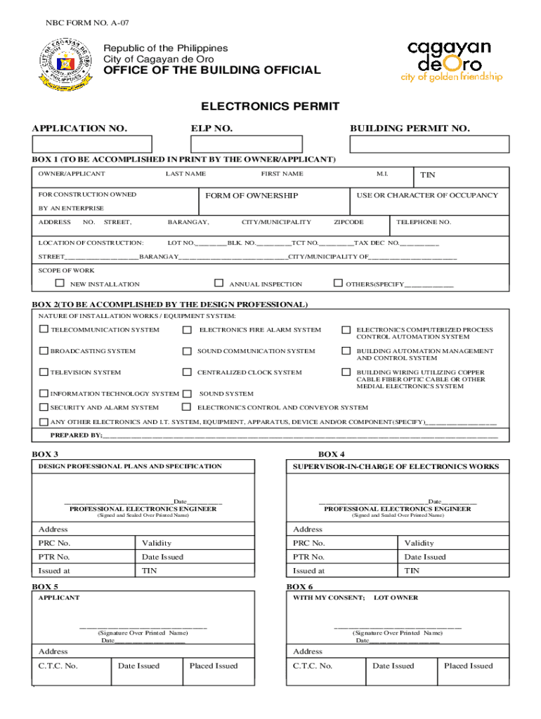 APPLICATION NO.ELP NO.BUILDING PERMIT NO.BOX 1 (TO BE ACCOMPLISHED IN PRINT BY