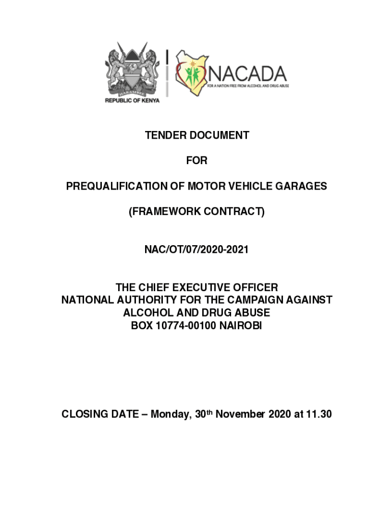 TENDER DOCUMENT FOR PREQUALIFICATION OF MOTOR VEHICLE GARAGES (FRAMEWORK CONTRACT)NAC/OT/07/20202021THE CHIEF EXECUTIVE OFFICER NATIONAL AUTHORITY FOR THE CAMPAIGN AGAINST ALCOHOL AND DRUG ABUSE BOX
