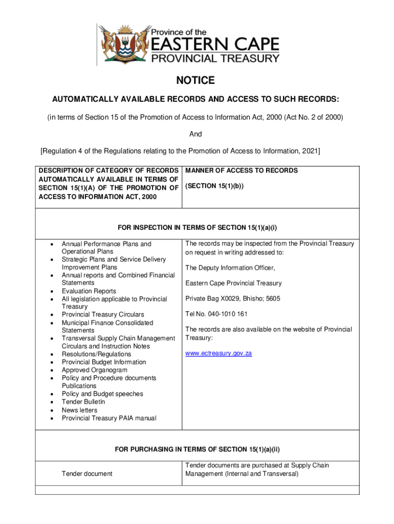 NOTICE AUTOMATICALLY AVAILABLE RECORDS AND ACCESS TO SUCH RECORDS: (in terms of Section 15 of the Promotion of Access to Information Act, 2000 (Act No. 2 of 2000) And [Regulation 4 of the Regulations