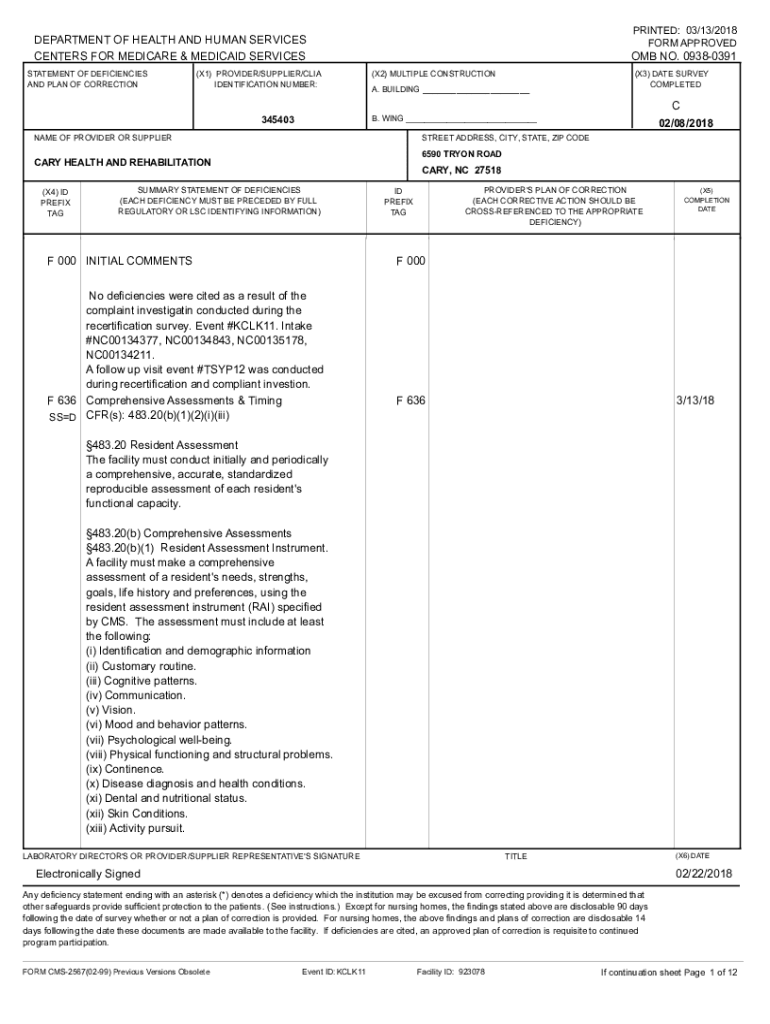 PRINTED: 03/13/2018 FORM APPROVEDDEPARTMENT OF HEALTH AND HUMAN SERVICES CENTERS FOR MEDICARE & MEDICAID SERVICES STATEMENT OF DEFICIENCIES AND PLAN OF CORRECTION(X1) PROVIDER/SUPPLIER/CIA IDENTIFICATION
