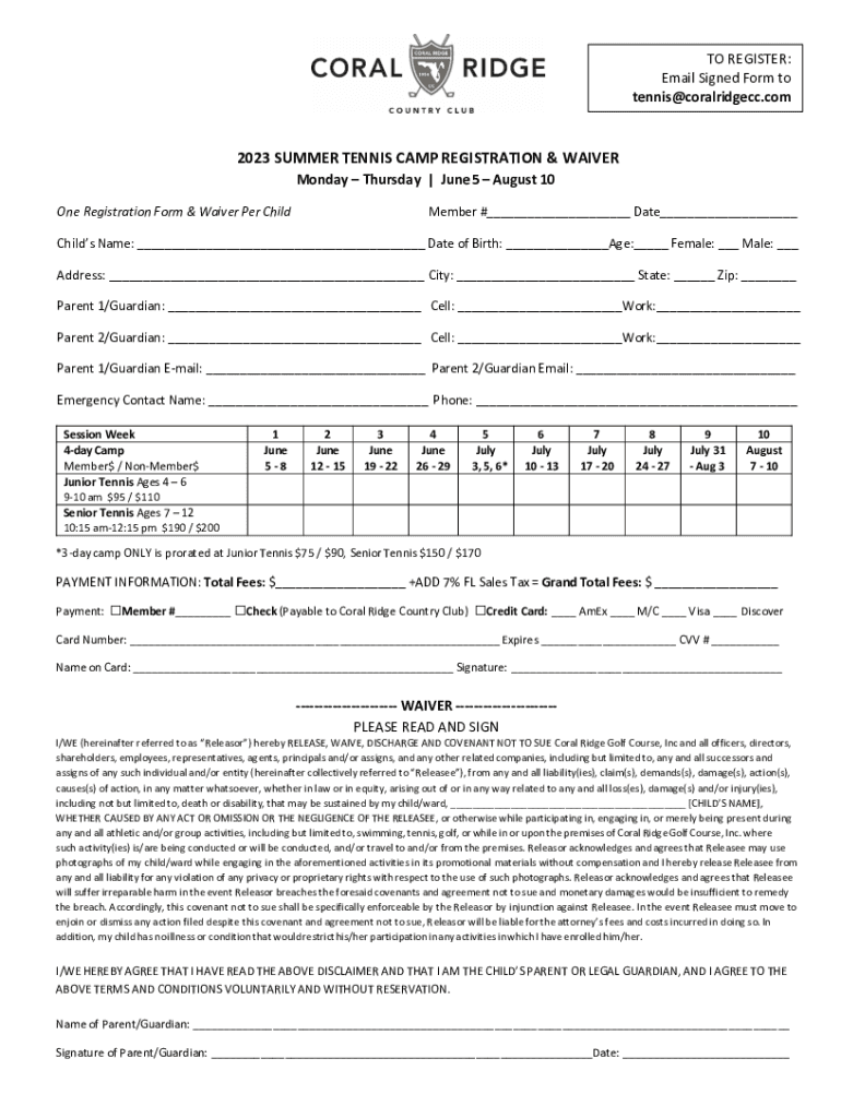 TO REGISTER: Email Signed Form to tennis@coralridgecc.com2023 SUMMER TENNIS CAMP REGISTRATION & WAIVER Monday Thursday | June 5 August 10One Registration Form & Waiver Per Childminder #___ Date___Childs