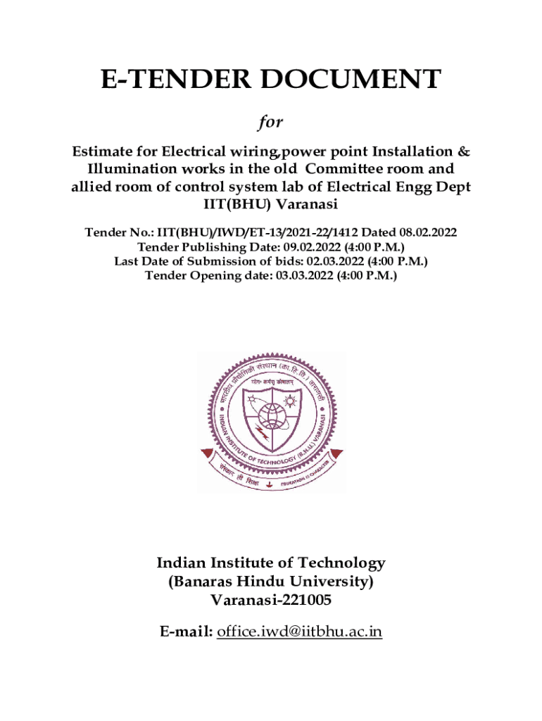 TENDER DOCUMENT for Estimate for Electrical wiring,PowerPoint Installation & Illumination works in the old Committee room and allied room of control system lab of Electrical Egg Dept IIT(BHU) Varanasi