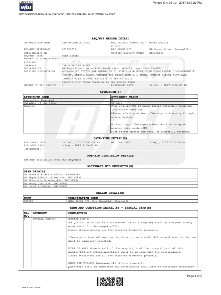 Printed On: 24 Jul, 2017 3:09:22 PM CFP DRAPER, BAEL, BAEL DRAPER, POSTAL CODE :263153, UTTARANCHAL, INDIA/NIT HEADER DETAIL
