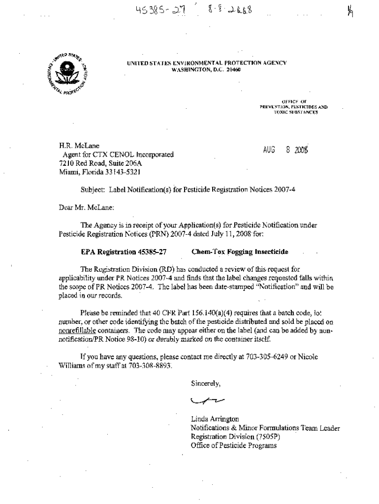 UNITED STATES ENVIRONMENTAL PROTECTION AGENCY WASHINGTON, D.C. 20460OFFICE OF PREVENTION, PESTICIDES AND TOXIC SUBSTANCES. R. Plane Agent for CTV CELL Incorporated 7210 Red Road, Suite 206A Miami,