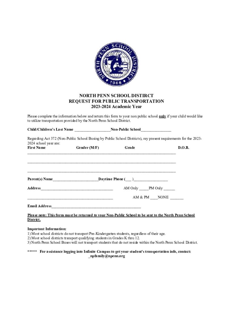 NORTH PENN SCHOOL DISTINCT REQUEST FOR PUBLIC TRANSPORTATION 20232024 Academic Year Please complete the information below and return this form to your non-public school only if your child would like