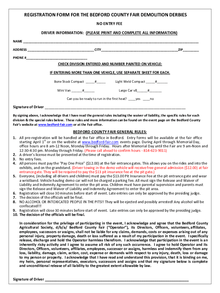 REGISTRATION FORM FOR THE BEDFORD COUNTY FAIR DEMOLITION DERBIES NO ENTRY FEE DRIVER INFORMATION: (PLEASE PRINT AND COMPLETE ALL INFORMATION) NAME ___ ADDRESS ___ CITY___ZIP___ PHONE #___CHECK DIVISION