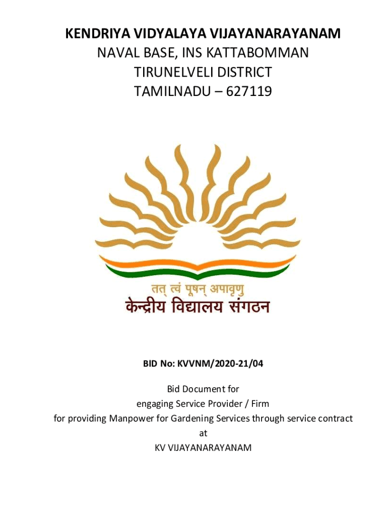 KENDRA HIMALAYA VIJAYANARAYANAM NAVAL BASE, INS KATTABOMMAN TIRUNELVELI DISTRICT Tamil Nadu 627119BID No: KV VNM/202021/04 Bid Document for engaging Service Provider / Firm for providing Manpower
