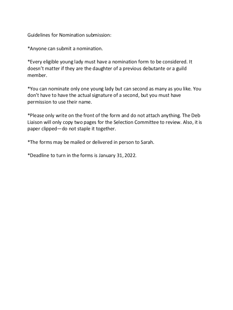 Guidelines for Nomination submission: *Anyone can submit a nomination. *Every eligible young lady must have a nomination form to be considered. It doesn't matter if they are the daughter of a previous
