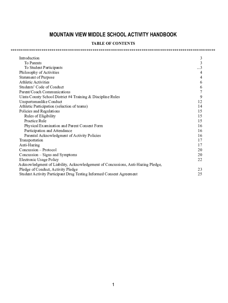 MOUNTAIN VIEW MIDDLE SCHOOL ACTIVITY HANDBOOK TABLE OF CONTENTS **************************************************************************************************** Introduction To Parents To Student