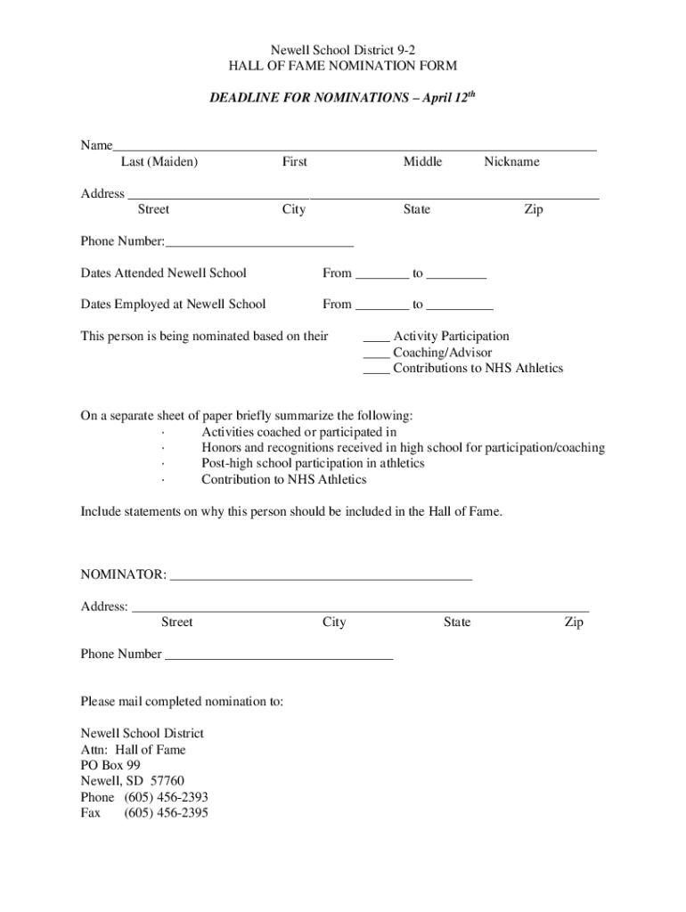Get the free Newell School District 9-2 HALL OF FAME NOMINATION ...