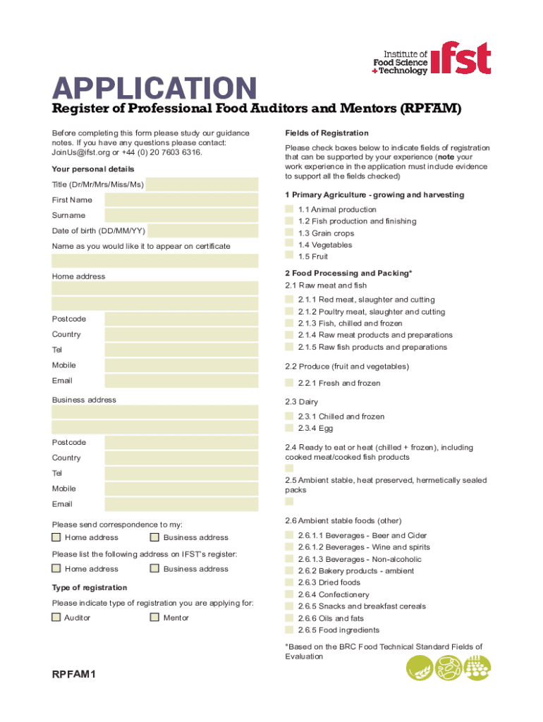 APPLICATION Register of Professional Food Auditors and Mentors (RP FAM) Before completing this form please study our guidance notes. If you have any questions please contact: JoinUs@ifst.org or +44