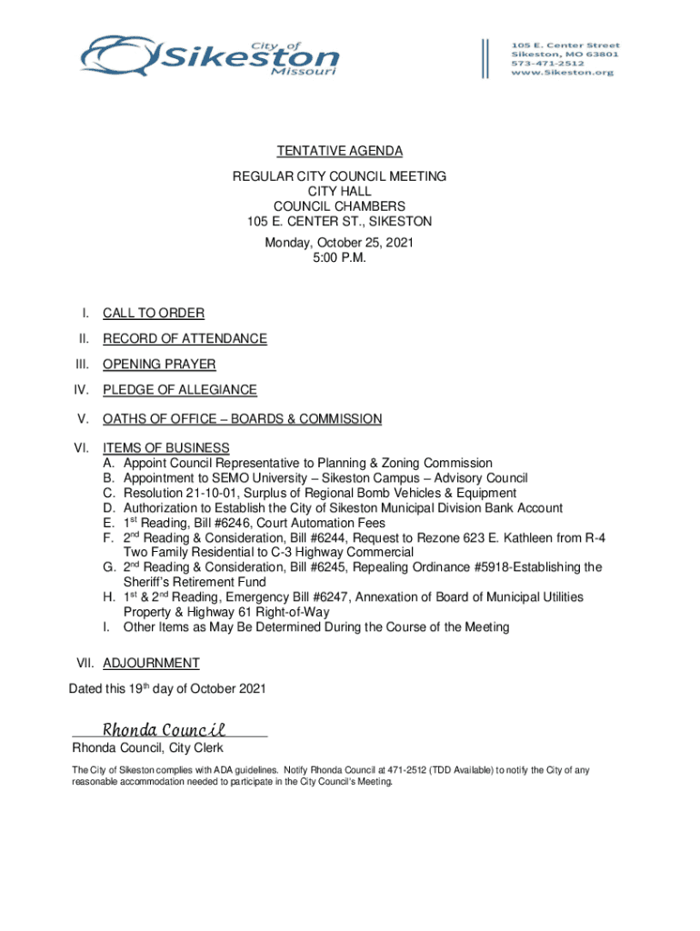 TENTATIVE AGENDA REGULAR CITY COUNCIL MEETING CITY HALL COUNCIL CHAMBERS 105 E. CENTER ST., LIMESTONE Monday, October 25, 2021 5:00 P.M.I.CALL TO ORDER.RECORD OF ATTENDANCE.OPENING PRAYER IV.PLEDGE