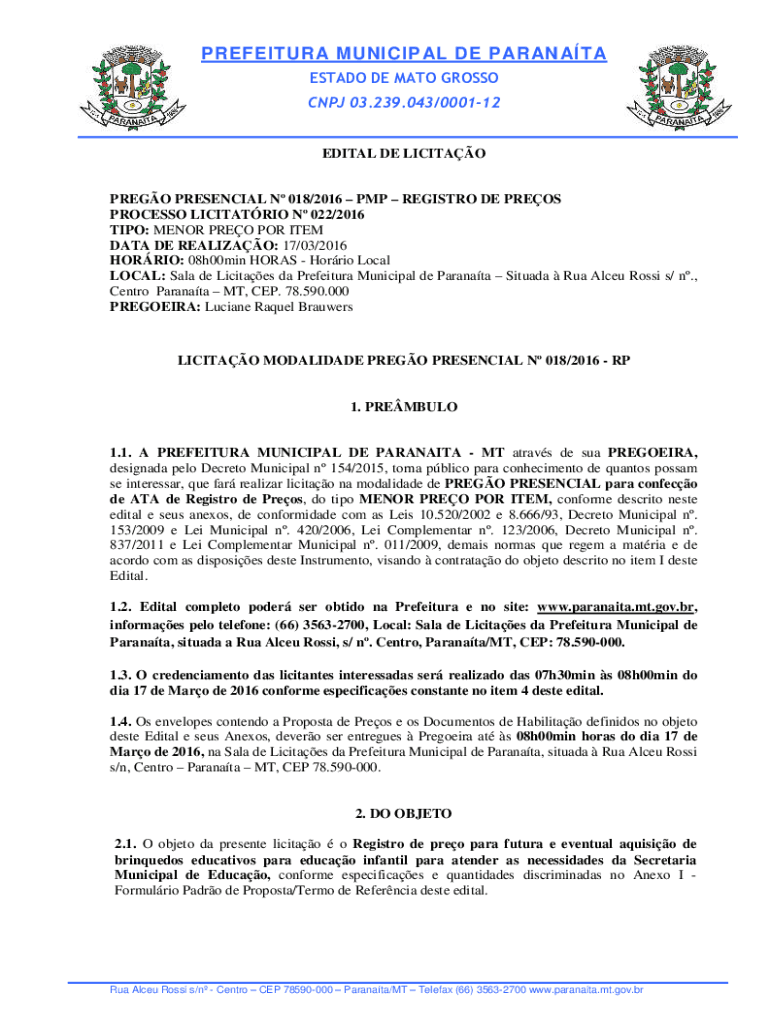 PREFECTURE MUNICIPAL DE PARANOIA ESTATE DE MATO GROSSO CNJ 03.239.043/000112EDITAL DE LICIT AO PRESO PRESENCE N 018/2016 PMP REGISTRY DE PRESS PROCESS LIMITATION N 022/2016 TIP: MINOR PRO POR ITEM