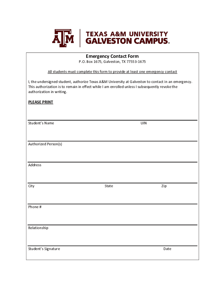 Get the free Emergency Contact Form - Texas A&M Galveston, TX