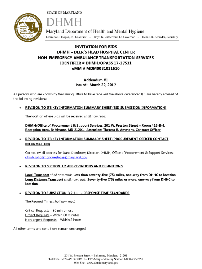 Lawrence J. Hogan, Jr., Governor Boyd K. Rutherford, Lt. Governor Dennis R. Schrader, SecretaryINVITATION FOR BIDS