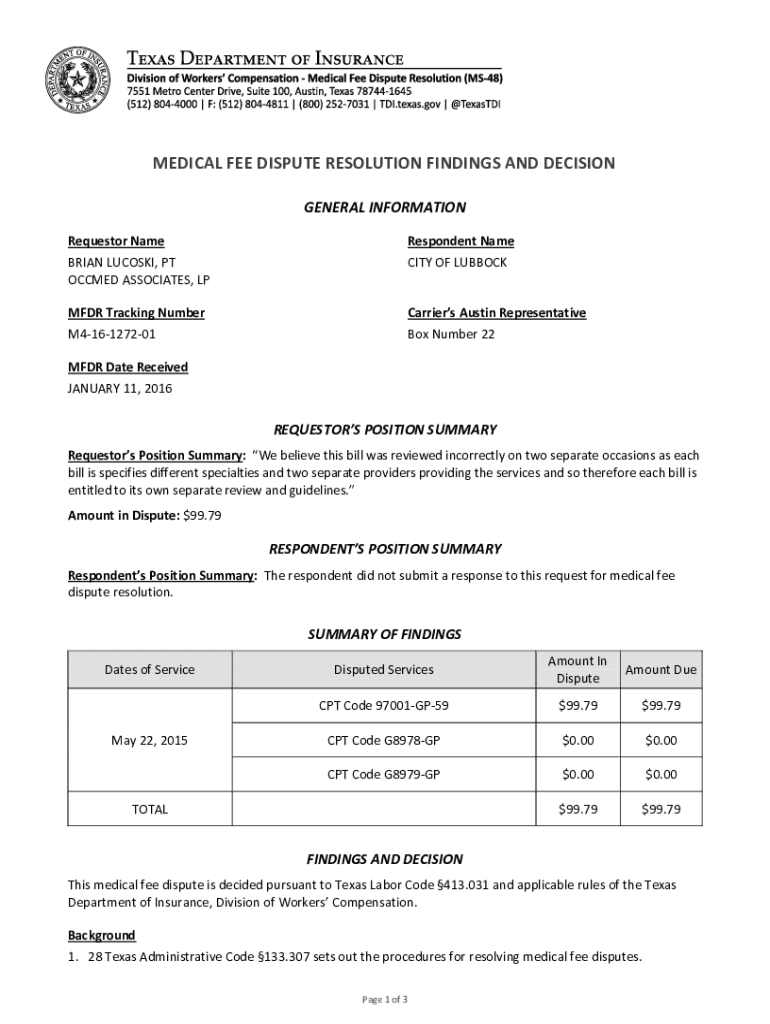 MEDICAL FEE DISPUTE RESOLUTION FINDINGS AND DECISION