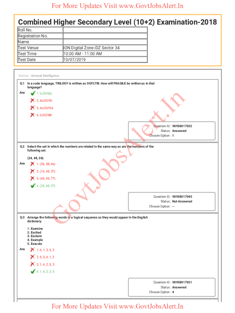 For More Updates Visit www.GovtJobsAlert. Uncombined Higher Secondary Level (10+2) Examination2018 Roll No. Registration No. Name Test Venue Test Time Test Nation Digital Zone ID Sector 34 10:00 AM