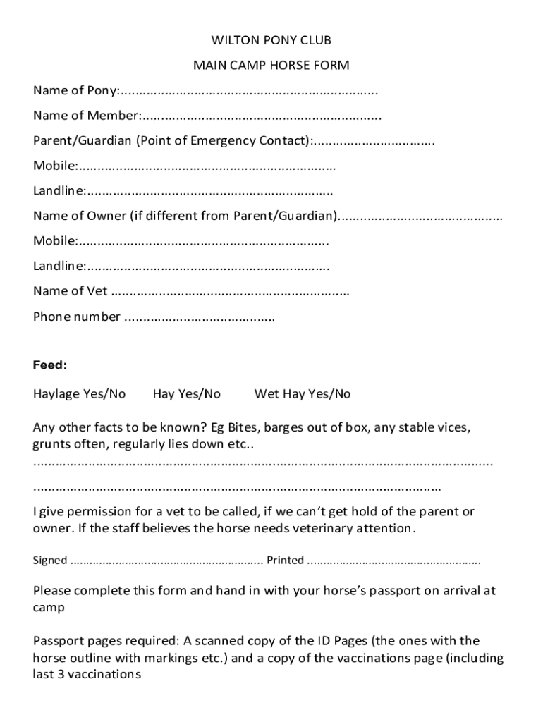 WILTON PONY CLUB MAIN CAMP HORSE FORM Name of Pony:...................................................................... Name of Member:.................................................................