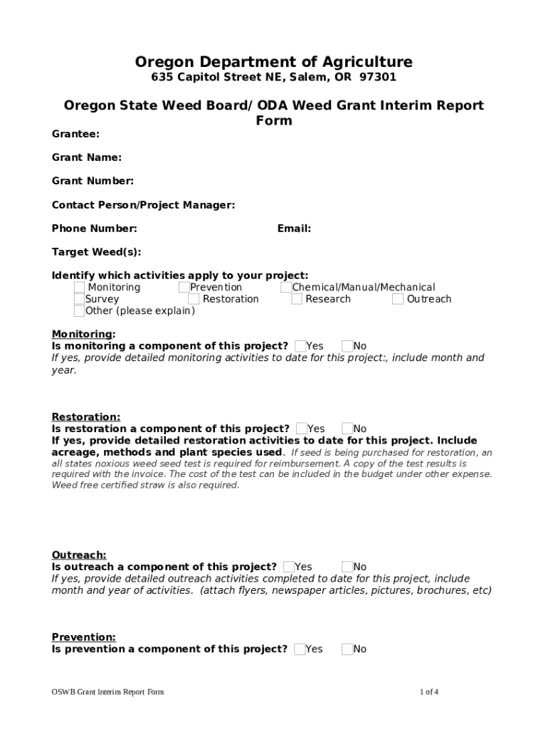 The OSWB Grant Program Interim Reporting is a fillable form in MS Word extension needed to be submitted to the required address in order to provide some information. It must be completed and signed, which can be done manually, or using a certain software such as PDFfiller. This tool lets you fill out any PDF or Word document directly in your browser, customize it according to your purposes and put a legally-binding electronic signature. Right after completion, the user can send the OSWB Grant Program Interim Reporting to the relevant individual, or multiple recipients via email or fax. The template is printable as well from PDFfiller feature and options presented for printing out adjustment. In both electronic and in hard copy, your form will have got neat and professional appearance. Also you can turn it into a template for later, so you don't need to create a new blank form from scratch. All you need to do is to customize the ready form.