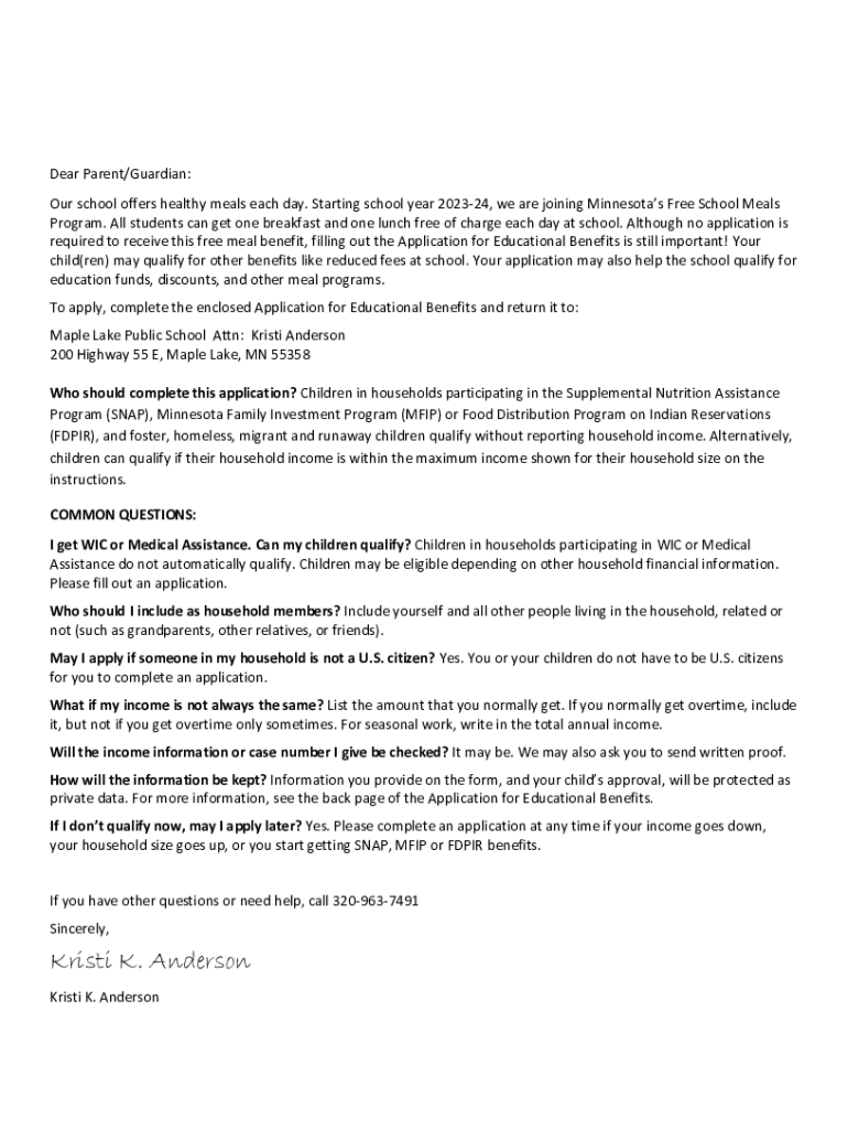 Dear Parent/Guardian: Our school offers healthy meals each day. Starting school year 202324, we are joining Minnesota's Free School Meals Program. All students can get one breakfast and one lunch