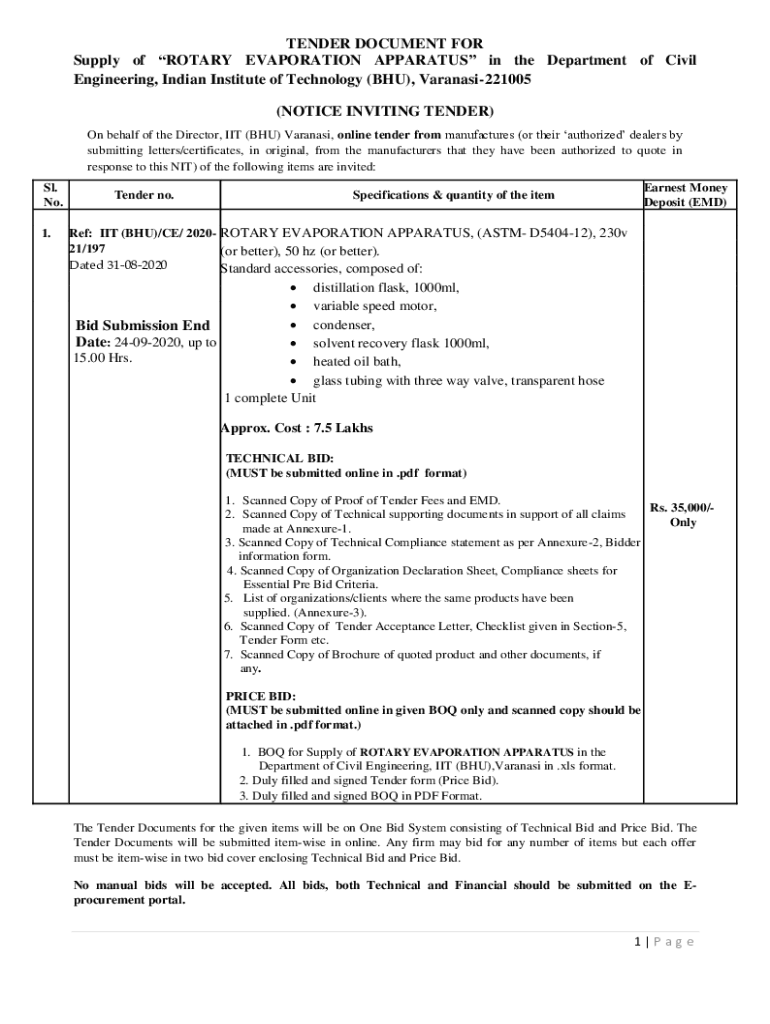 TENDER DOCUMENT FOR Supply of ROTARY EVAPORATION APPARATUS in the Department of Civil Engineering, Indian Institute of Technology (BHU), Varanasi221005 (NOTICE INVITING TENDER) On behalf of the Director,