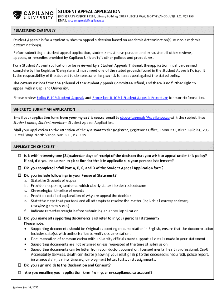 STUDENT APPEAL APPLICATION REGISTRARS OFFICE, LB152, Library Building, 2055 PURCELL WAY, NORTH VANCOUVER, B.C., V7J 3H5 EMAIL: studentappeals@capilanou.caPLEASE READ CAREFULLY Student Appeals is for